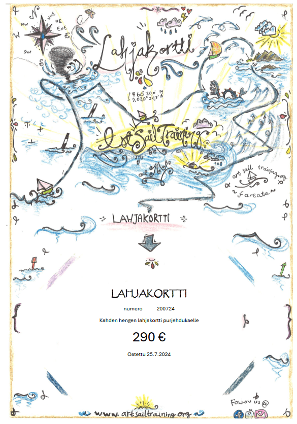 Lahjakortilla saa vastaavan summan alennuksen purjehduksen normaalihinnasta. Lahjakortti ja vahvistus toimitetaan noin viikon sisällä tilauksesta. Lahjakortti on voimassa aina vähintään 12 kk ja sovittaessa pidempään. Lahjakorttia voi käyttää mihin tahansa purjehduksen tai muun tuotteen maksuun verkkokaupassa.