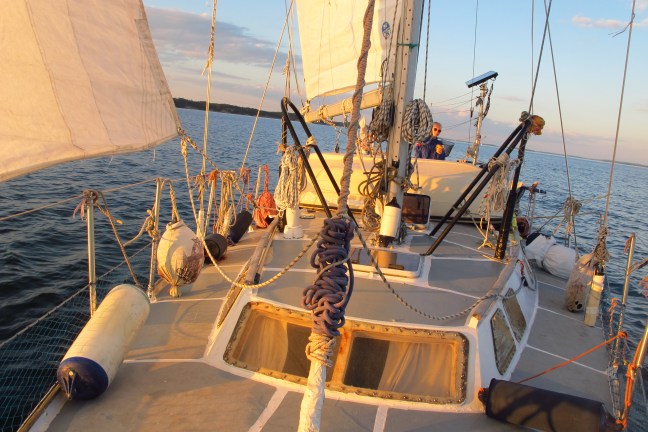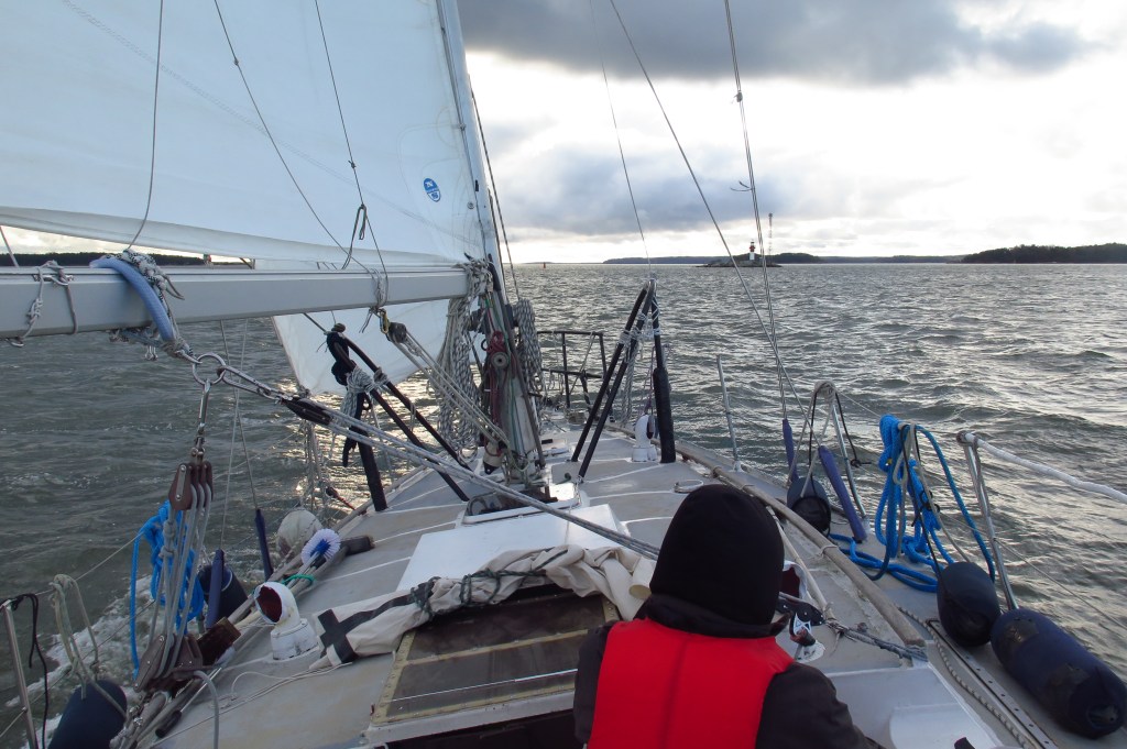 Käänsin ruoria yli kiemurrellen kuin käärme puolelta toiselle saadakseni veneen vauhtia hidastumaan – niin sanottu crash-stop. Reippaassa tuulessa vauhtia oli kertynyt jo liiankin paljon, eikä veneessä ole jarrua ilman konetta. Ajoankkurista olisi ollut suurta hyötyä, mutta se oli epäonnekseni liian syvällä kansiluukussa piilossa, enkä ehtinyt kaivamaan sitä esille.